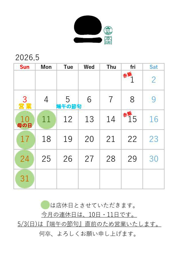 2026年5月の営業カレンダーを更新いたしました。